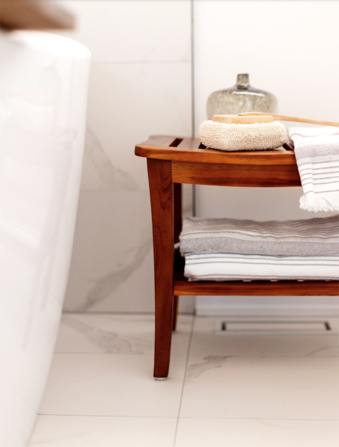 One simple way to elevate your space is by incorporating a stone or tile baseboard. This gives an elevated appearance to your bathroom but it also allows you to run the waterproof membrane above the floor for additional protection against water intrusion.