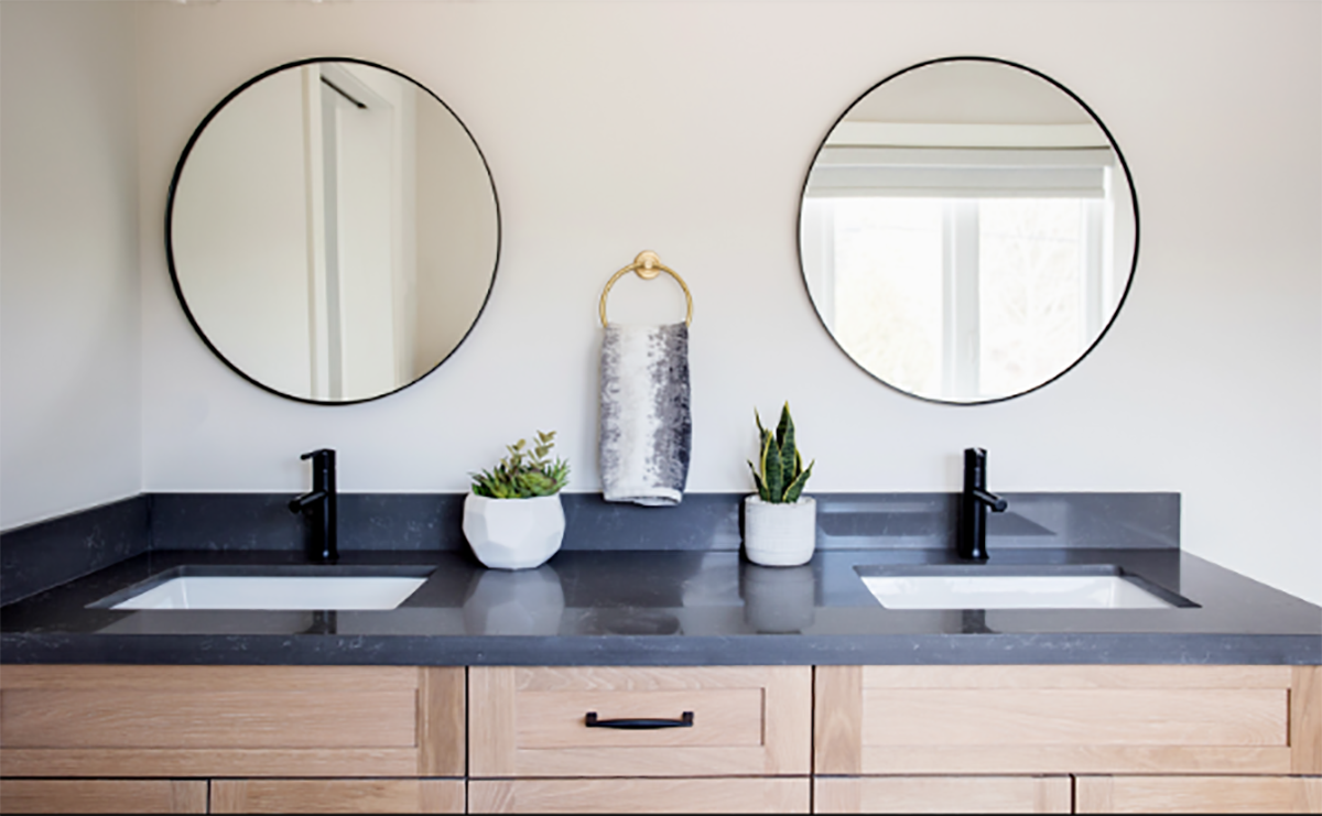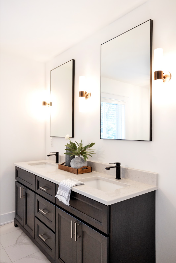 It’s sometimes hard to make a statement in your bathroom because it’s just so small. One way I like to add some visual interest is by incorporating mixed metals. If you want to add a touch of trend to your bathroom consider using gold or black for your vanity mirror and stick with brushed or polished nickel for the plumbing fixtures.