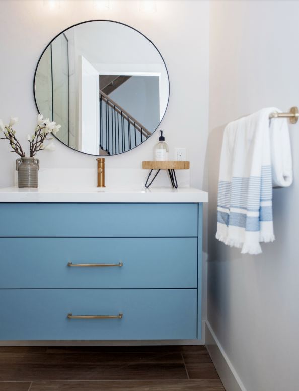 Even if you want to create custom storage in your bathroom a ready-made vanity can be the perfect starting point. These are inexpensive and give you a blank slate to start. You can customize these by painting, adding additional millwork, switching the hardware and even upgrading the vanity top if you like.