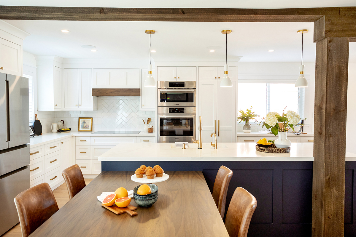 One of the easiest ways to mix materials is through the cabinetry selections. I love to mix a painted cabinet with a wood cabinet or two different paint colours on various cabinets. The effect is always unique and looks customized for you.