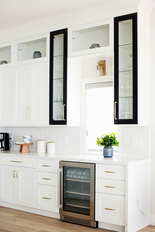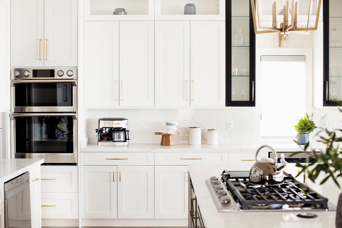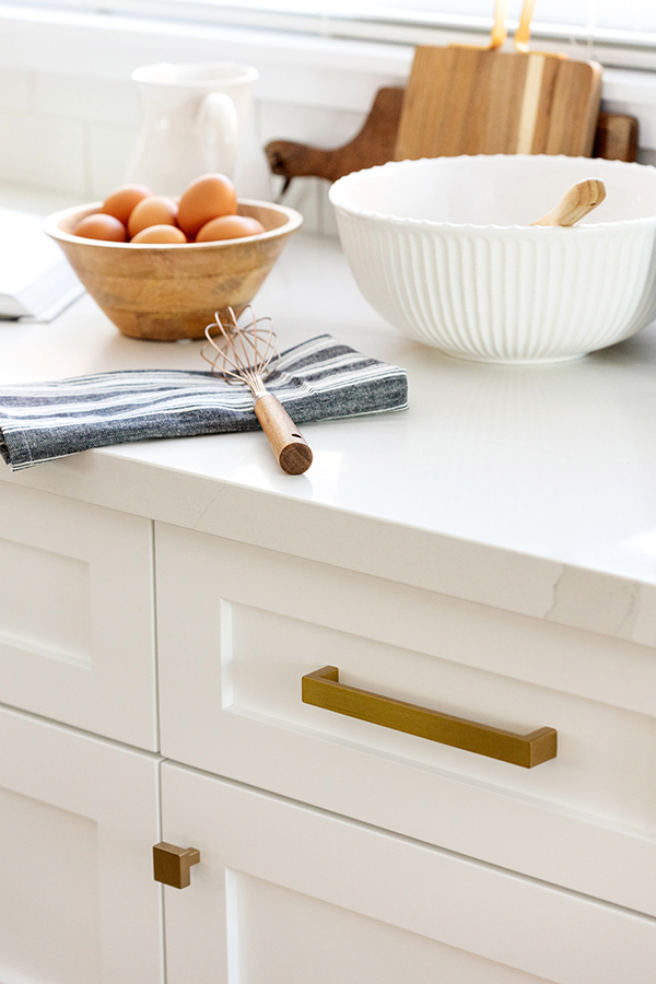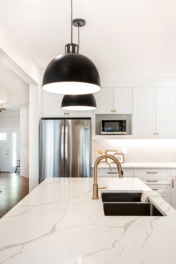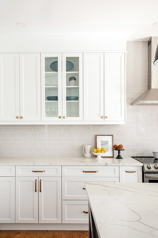 Quartz has taken the first place in countertop materials over the last few years. In the past we all wanted granite but we have slowly moved away from that and towards this more durable and easy material. I particularly love using quartz to design waterfall countertops like I did in this kitchen renovation. We also love to add quartz as the backsplash. Doing so offers an easy to clean, durable and cohesive look.
