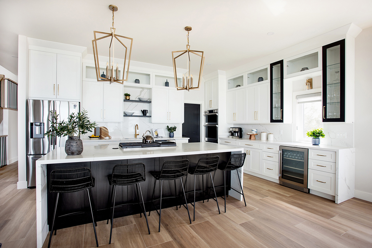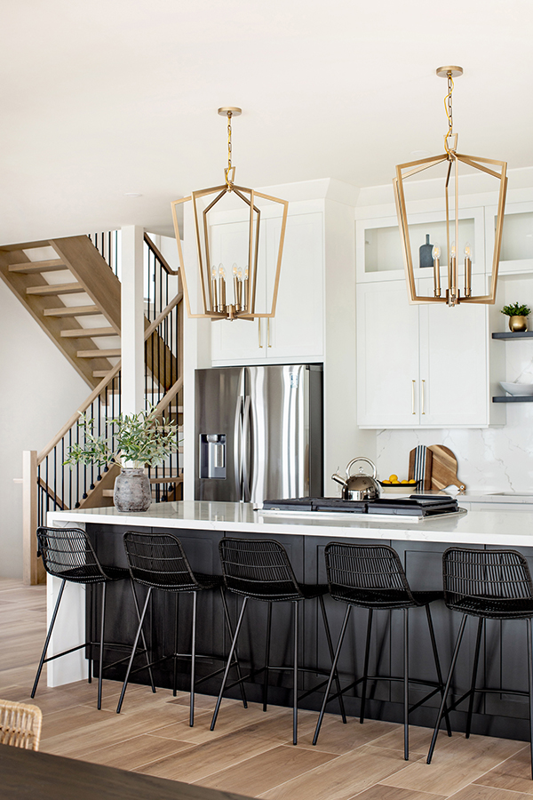 One of the most impactful ways to accomplish this is through pendants and light fixtures. Look for pieces that have a strong visual impact but also help to offset the straight lines of cabinetry. Pendants can also create an elevated look in your space and you don’t always have to pay a lot for statement pendants. If you want to learn more about the importance of lighting in every room including your kitchen, read this post.