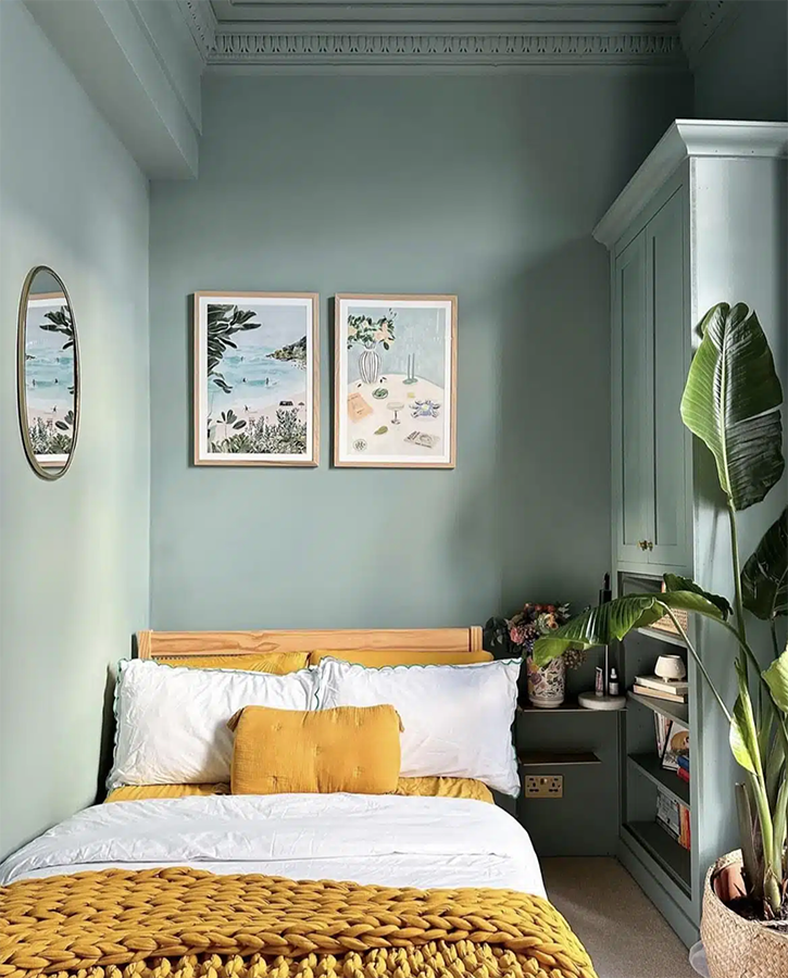 We’ve long associated green with nature and growth as well as a feeling of peaceful calm. We saw a resurgence of popularity in green immediately after the pandemic as it gave us a safe and comforting feeling. Bedrooms are a perfect space to try out colour drenching in green.
